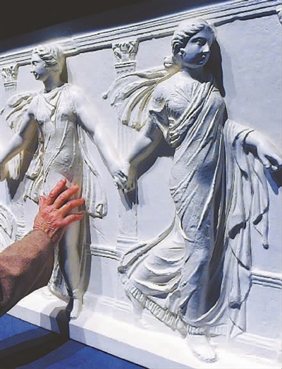 1月24日,一名参观者在触摸大理石雕塑作品《博尔盖斯的女舞者》的复制品。
