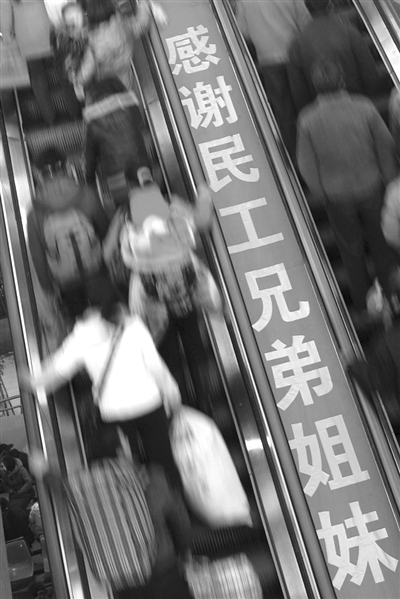 1月29日,在杭州火车站,旅客乘自动扶梯前往候车大厅,扶梯旁挂着写有“感谢民工兄弟姐妹”的条幅。