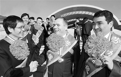 1月31日,来自叙利亚的安东阿克瑞(前中)和哈萨克斯坦的康斯别克(前右)等人在北京荣获中国石化国际石油勘探开发公司年度劳动模范称号。当日,在中国石化国际石油勘探开发公司年终工作会议上,18名受表彰的工作人员中出现了两个洋面孔。新华社发(胡庆明 摄)