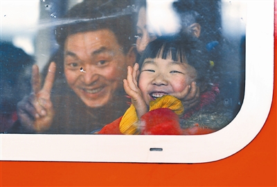 1月31日,一位外来务工人员带着孩子坐上由杭州开往重庆的列车,即将回家过年的孩子露出灿烂的笑容。