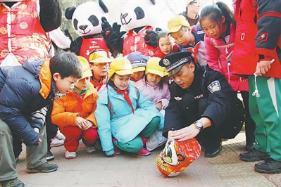 2010年1月18日,熊猫烟花公司的“熊猫”走进校园,配合北京市朝阳警方与朝阳区烟花办、教委等部门共同举行的“安全燃放烟花爆竹、防范电信网络诈骗宣传进校园”活动。图为民警教小学生如何燃放烟花。金国 摄