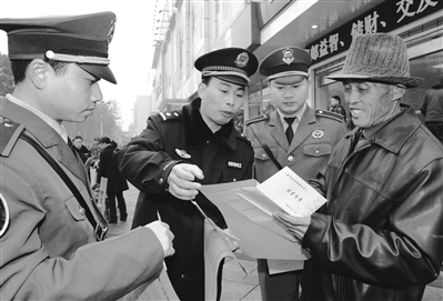 日前,湖南省怀化市公安局组织全市13个县(市、区)公安民警、保安人员、青年志愿者4000多人深入街头、农村、学校、社区、厂矿、单位,多角度多形式地宣传国务院颁布从2010年元月1日起施行的《保安服务管理条例》。图为公安民警、保安人员、青年志愿者正在给群众讲解《保安服务管理条例》,发放有关资料。