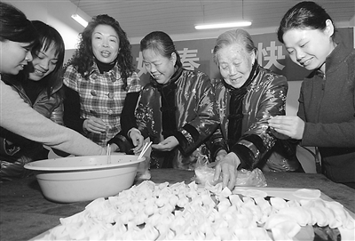 2月2日,“社区儿女”与空巢“妈妈”一起包饺子迎新春。