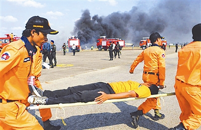 2月2日,柬埔寨首都金边的一个空军基地举行空难演习,提高发生空难时各部门的协调能力及救援人员的应急处理能力,图为参加空难演习的救援人员运送一名“空难遇难者”。阿健 供图
