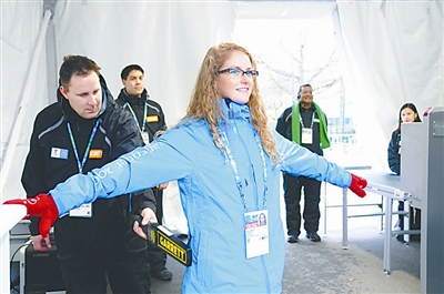 2月1日,一名工作人员(前)扮演的观众在进入场馆时接受金属探测器的检查。当日,2010年温哥华冬奥会组委会在将要举行花样滑冰和短道速滑比赛的太平洋体育馆向媒体演示了观众入场时接受安全检查的过程。组委会的官员说,冬奥会场馆的安全检查与机场的安全检查非常类似。新华社记者 马丹 摄