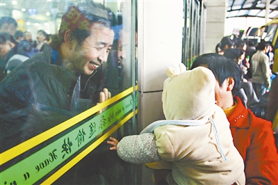 2月3日,福建晋江长途汽车站。回家的人潮中,爷孙俩隔着玻璃在打招呼。今年春运开始后,全国各个交通部门全力以赴保春运,人们回家的路通畅了不少。王家煜 摄