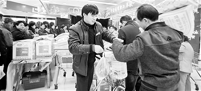 2月2日,工作人员在给困难职工发放爱心物资。江西宜春市袁州区总工会拿出7万元专项帮扶资金,与比一比购物中心联合购置了一批优质大米、食用油和鲜肉等物资,按每户200元的标准,直接发放到困难职工手中。 刘继刚 摄