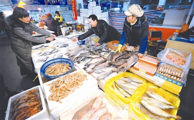 2月2日,一位顾客(左)在天津一家农副水产食品城选购冷冻海产品。
