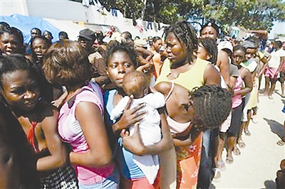 海地受灾民众中大约有3.7万名孕妇,她们严重缺乏饮用水、食物和药品。联合国借鉴了世界其它灾区的救助模式,在海地首都太子港设立16个发放点,主要给女性、老年人和残疾人分发食品券。图为妇女们排队领取饮用水和食品。阿健 供图