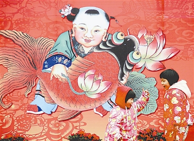 2月1日,两名小朋友在年画艺术节现场布置的大幅年画前玩耍。 当日,“2010金陵·首届中华年画艺术节”在南京市中华门城堡广场拉开帷幕。 新华社发(董金林 摄)