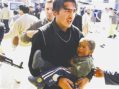 巴基斯坦西北边境省下迪尔一座新落成女子学校附近3日发生路边炸弹袭击事件,造成至少8人死亡,其中包括4名外国人以及3名学生,另有50多人受伤。图为一名男子从爆炸现场救出一名受伤儿童。吉平 供图