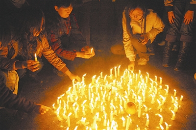 图为2月1日晚,众多市民自发聚集在市民广场,在寒夜里点燃蜡烛深切悼念为抢救落水儿童而牺牲的青年英雄黄船钉、冯军政。倪树斌摄