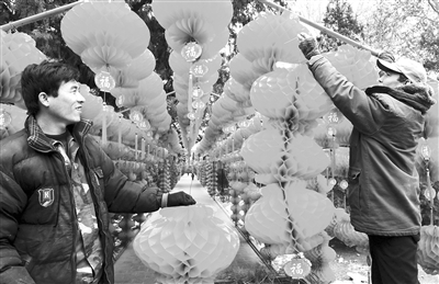2月6日是农历腊月廿三,也是中国传统节日中的小年。在这一天,人们要剪窗花、写春联,挂灯笼,小年拉开了过大年的序幕。图为在北京地坛公园内,职工们挂起灯笼迎接第25届春节文化庙会的到来。