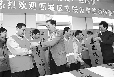 2月5日下午,北京市西城区金融街街道社区服务中心保洁一队的活动室热情洋溢。西城区文联邀请10余位书法家来到这里,挥毫泼墨,为在该街道工作的140位外来务工的保洁队员、绿化队员书写春联。