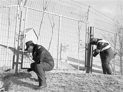 为确保春运通道安全,辽宁锦州铁路公安处采取实地踏查的方式积极开展隐患排查整改活动。据悉,此次隐患排查共发现整改网底超高、护网间隙过大等安全隐患165件,并一一进行整改。图为民警带领护路队员检查整改护网隐患时的情形。 杜永克 摄