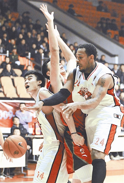 2月7日,在CBA联赛第22轮比赛中,吉林东北虎队主场对阵辽宁盼盼队。图为吉林克林斯(右)在比赛中争夺篮板球。 新华社记者 蒋林 摄