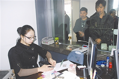 2月10日,浙江省温岭市箬横镇玉麟农村资金互助社的一名职员(左)为当地西瓜种植户办理贷款业务。