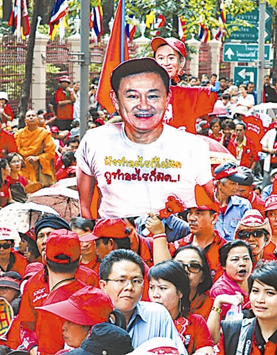 2月10日,在泰国首都曼谷的泰国国家警察局外,泰国民间政治团体反独裁民主联盟(反独联)的1000多名支持者“红衫军”高举前总理他信的头像参加集会。他们要求加快起诉带领示威者占领泰国总理府和封锁曼谷两大机场的人民民主联盟(民盟)领导人。