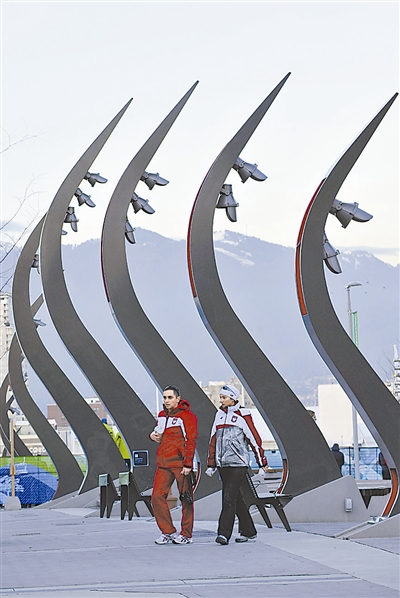 2月9日,在加拿大温哥华冬奥会奥运村,运动员从雕塑前走过。温哥华冬奥会奥运村位于温哥华市中心,占地15万平方米。冬奥会期间,将有3000多名运动员和官员入住。奥运村有个美丽的名字——“千年·水”。