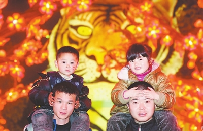 2月6日,在四川省自贡市彩灯公园里,游客们在赏灯。当日,为期50天的第十六届自贡国际恐龙灯会在自贡市彩灯公园正式亮灯展出。高达18米的老虎灯组、品种齐全的桃花灯组,把自贡彩灯公园装扮成彩灯的海洋。新华社记者 江宏景 摄