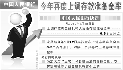 央行宣布,从2010年2月25日起,上调存款类金融机构人民币存款准备金率0.5个百分点。为加大对“三农”和县域经济的支持力度,农村信用社等小型金融机构暂不上调。