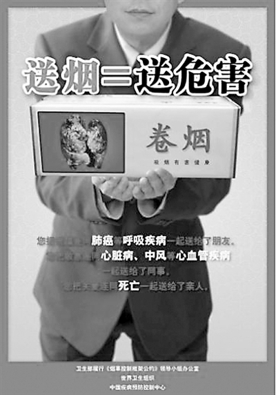 “目前,我国吸烟人数超过3亿,成为世界上因烟草使用导致的潜在死亡人数最多的国家,送烟、敬烟让这个严重的公共卫生问题更为严重,如何改变这些不良的社会习惯,是我国控烟履约工作的重点和难点。”中国疾病预防控制中心副主任、控烟办公室主任杨功焕教授指出:“2009年初春节期间,我们合作开展了‘送烟就是送危害’宣传活动,活动后的评估结果显示,仅电视广告宣传就达到了超过2.58亿人次受众,这些广告让许多人认识到烟草的危害,重新考虑是否把卷烟作为礼物。但众所周知,改变以烟作为礼品的社会风俗习惯不是一朝一夕可以完成的事情,需要我们进行详细的计划和不懈的努力。此次开展的活动正是去年活动的延续,目的是最终消除以烟作为礼品的陋习。”(魏文)