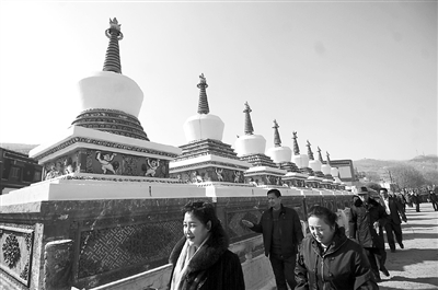 2月18日,游客在塔尔寺内的八宝如意塔下转塔祈福。