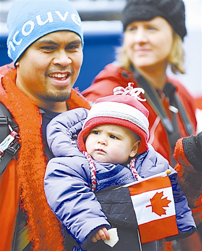 2月16日,一位男士带着孩子在冬奥会雪橇赛场观看比赛。温哥华冬奥会期间,众多家长把孩子带到赛场感受奥运氛围,为紧张的比赛场增添了些许轻松活泼。新华社记者 申宏 摄