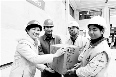新春之际,中国中铁股份公司工会为在节日期间坚守工作岗位的一线职工送去“家的温暖”。图为公司工会副主席刘建媛(左一)和机关党委的领导一道, 来到中铁建工北京装饰公司复兴路69号工程项目部,为留守京城的农民工们送来猪肉、粉条、青菜、粮油等慰问品。