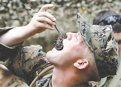 喝眼镜蛇血、吃蝎子肉,对普通人而言这或许是一场不可能完成的任务。2月上旬在泰国罗勇府举行的“金色眼镜蛇2010”军事演习中,参演士兵所接受的任务却远远不止这些,还被要求将蛇血涂抹在脸上和掌握捕捉有毒动物的技巧,吃的食物还有青蛙和蜥蜴。来自泰国、美国、印度尼西亚、日本、韩国和新加坡等6国的共计1.4万名陆军、海军陆战队队员、海军和空军参加了此次演习。图为美军士兵吃蝎子。杜林林摄