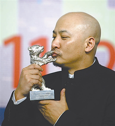 2月20日,在德国首都柏林,中国导演王全安在新闻发布会上亲吻银熊奖杯。当日,王全安执导的影片《团圆》获第60届柏林电影节最佳编剧银熊奖。新华社记者 罗欢欢摄