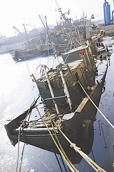 2月22日,停靠在大连市旅顺口区北海渔港的一艘渔船船舱进水下沉。