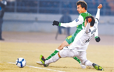 2010年亚冠联赛小组赛2月23日晚正式拉开帷幕,中超冠军北京国安队在北京工人体育场以1:0小胜澳超冠军墨尔本胜利队,取得赛季开门红。图为双方激烈拼抢场面。在另外一组的比赛中,长春亚泰客场0比1不敌鹿岛鹿角。本报记者 许之丰 摄