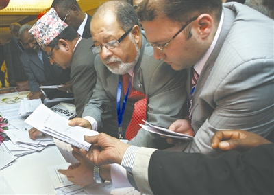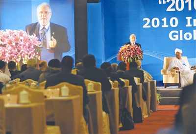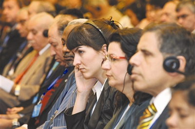2月25日上午,中外工会界代表在“2010’经济全球化与工会”国际论坛开幕式上。