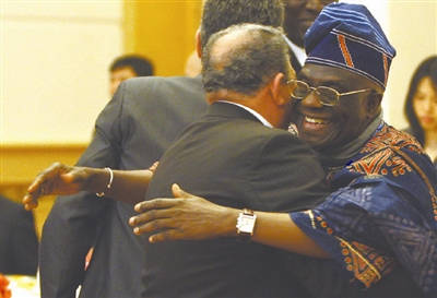 2月24日,两位在论坛上相识的老朋友热情拥抱。