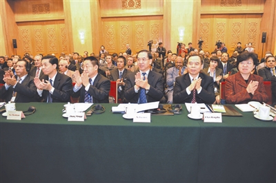 2月25日上午,参加论坛的代表们在人民大会堂认真听取王兆国发表的重要讲话。