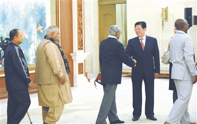 2月24日,王兆国在人民大会堂会见前来出席“2010’经济全球化与工会”国际论坛的外国工会领导人。