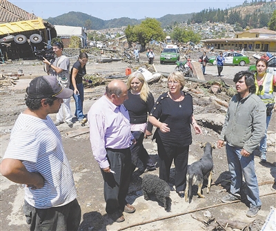 2月27日,在智利第8大区首府康塞普西翁,智利总统巴切莱特(右一)走访地震中受灾的当地居民。 新华社发(亚历克斯·伊瓦涅斯 摄)