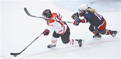 2月25日,在温哥华冬奥会女子冰球决赛中,加拿大队以2比0战胜美国队,获得冠军。这是加拿大队沃德(左)与美国队斯塔克拼抢。 新华社记者 武巍 摄
