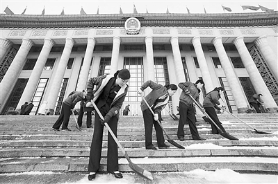 3月1日,人民大会堂工作人员在东门外除雪迎接两会开幕。江心 摄