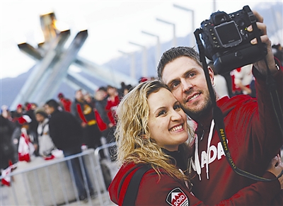 2月28日,一对情侣在即将熄灭的冬奥会火炬前留影。