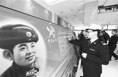3月2日,沈阳海关抚顺办事处工作人员在学习雷锋精神的主题展板上签名。