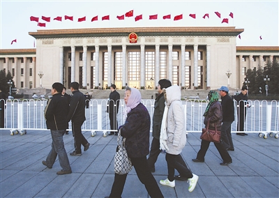 3月5日早晨6点50分,刚刚看完天安门广场升旗仪式的人们从人民大会堂门前走过。两个多小时后,这里将召开第十一届全国人民代表大会第三次会议。他们关心的民生问题将是这里的代表、委员们热议的焦点。 本报记者 杨登峰 摄