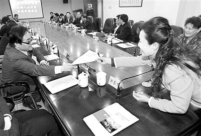 3月4日傍晚,前来参加全国两会的律师代表和委员来到中国律师协会“回娘家”,虽是短暂相聚,但他们还是抽出时间就各自的提案、议案进行了交流。来自北京的律师刘红宇(右)趁机就自己的提案征求大家的签名。针对最近北京连续发生杀害家人的惨剧,她希望加强心理干预,未雨绸缪,预防犯罪。