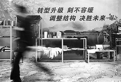 3月7日下午,在浙江团小组讨论会场外,一个特殊的展台上摆放的是浙江绍兴市传统优势产品——纺织品的原料及成品。据来自绍兴市的车晓端代表介绍,把产品摆到会场外,就是要告诫人们,生产方式的转型升级已经刻不容缓。本报记者 杨登峰 摄