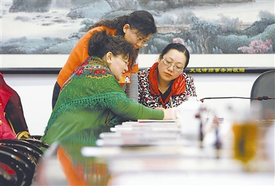 图为全国人大代表高明芹(图中)就自己的议案征询其他代表的意见。
