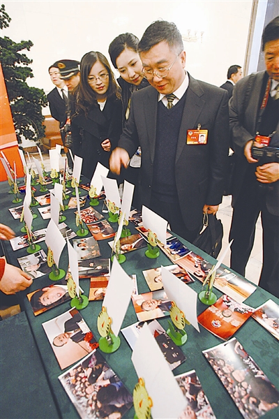 3月8日,在人民大会堂一媒体展台,一张张展现代表委员以及记者们飒爽英姿的照片被摆放在台前供大家各自挑选。主办方希望用这种方式记录下代表委员们在两会期间难忘的瞬间,让他们带回家里,时刻不忘使命。本报记者 杨登峰 摄