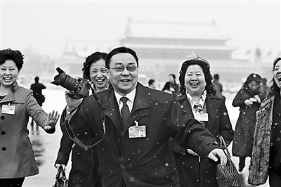 3月8日是国际劳动妇女节。正在北京参加两会的代表委员迎来了一场不期而遇的瑞雪。代表们在从天安门广场去往人民大会堂的路上,纷纷拿起相机合影留念,来自重庆的段拉卡代表在为本团的女代表服务拍照后,突然闯入记者的镜头,他希望把这张照片洗出来,当做节日礼物送给女代表们。