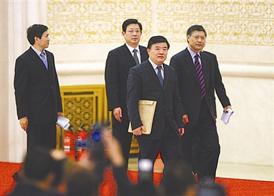 3月8日15时30分,十一届全国人大三次会议在人民大会堂金色大厅举行记者会,住房和城乡建设部部长姜伟新、卫生部部长陈竺、人力资源和社会保障部副部长胡晓义(从右至左)就保障和改善民生问题答记者问。 本报记者 杨登峰 摄