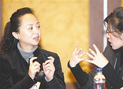 3月4日,一位手语翻译在政协文化艺术界小组会上为邰丽华委员(左)翻译与会委员的发言。